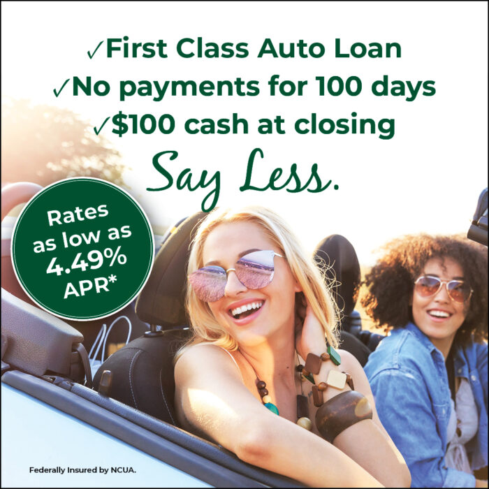 *Annual Percentage Rate. As low as rate includes a loyalty discount. Member must be approved & finance loan with First Class CCU to receive $100. $100 cash applies to purchased vehicles or loans refinanced from another lender. Offer subject to change without notice. All loans subject to approval. For a $20,000 car loan with a term of 60 months at 4.49% APR, the monthly payment will be $372.77. Current loans with FCCCU do not qualify. Loans approved under the First Class Acceptance program will not be eligible for 100 days no payments. Federally insured by the NCUA. Equal Housing Opportunity.